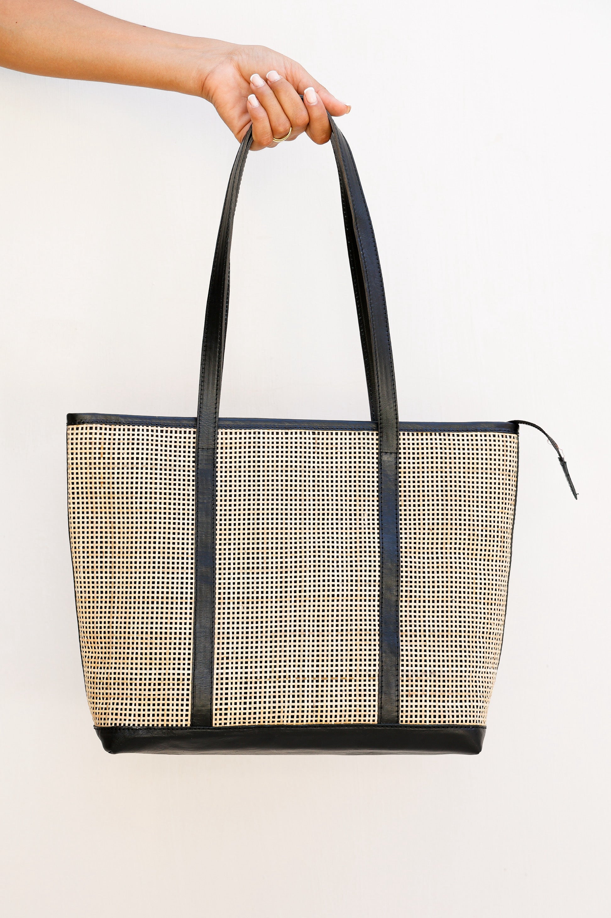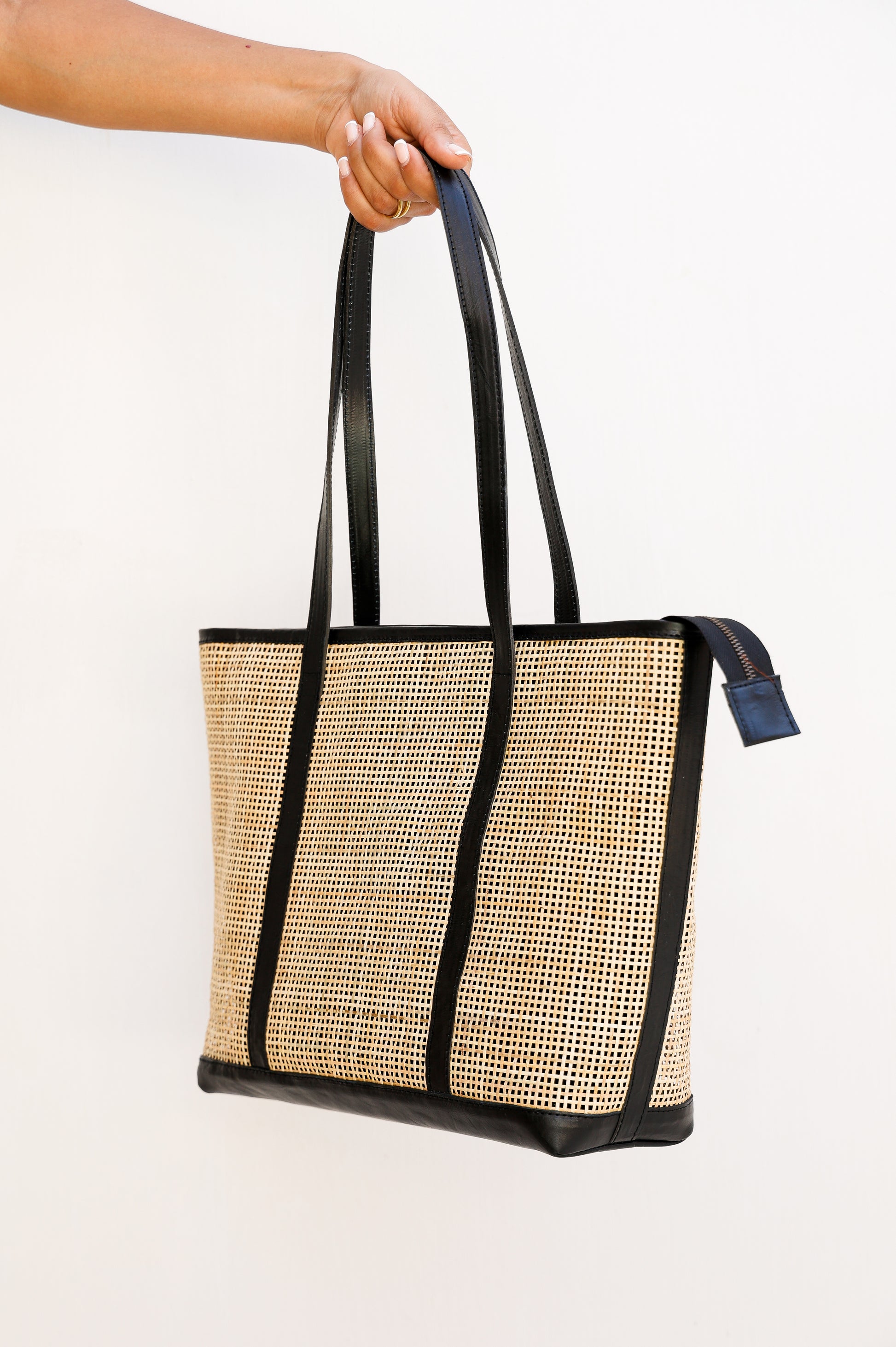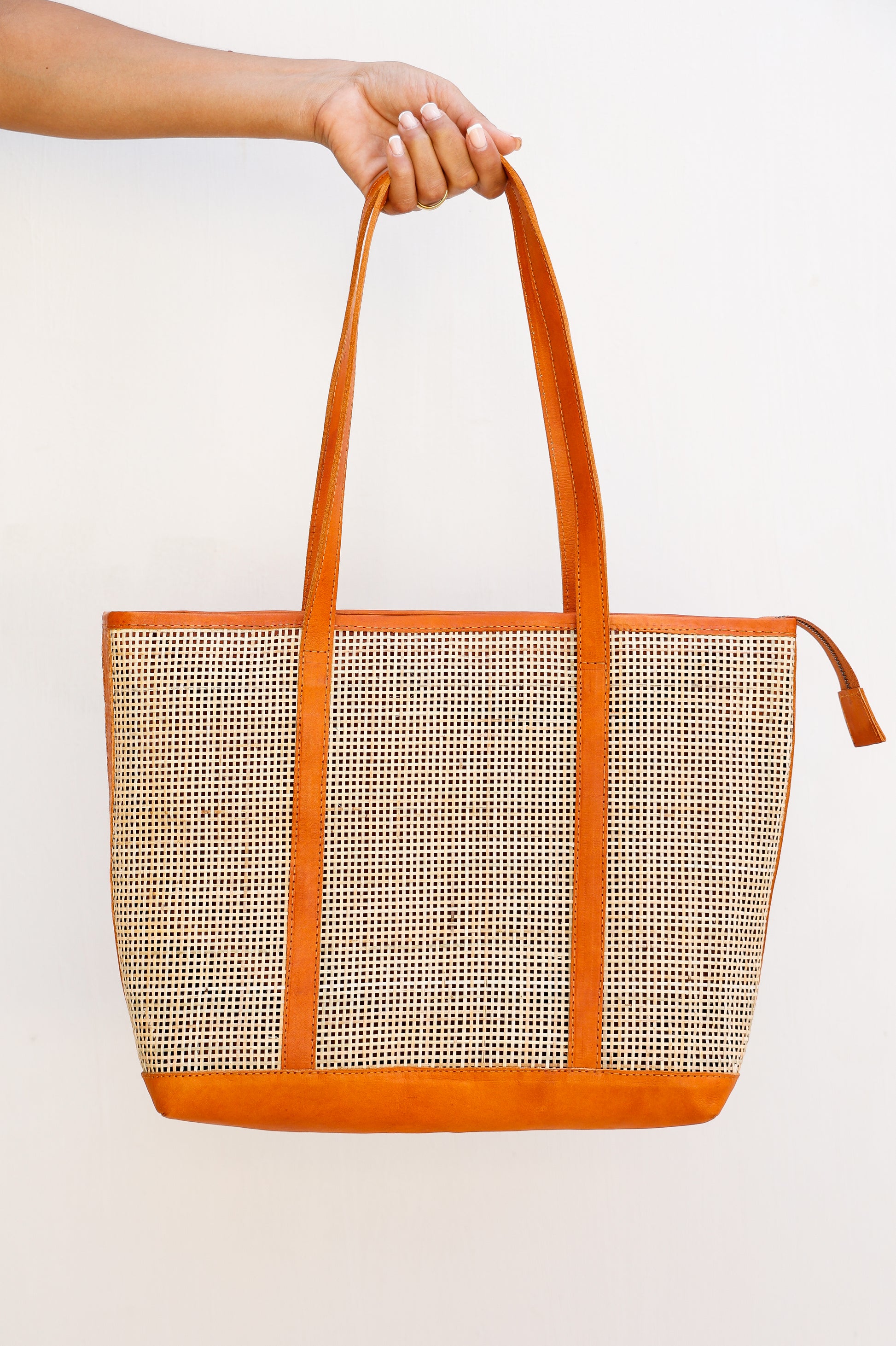 Handcrafted Rattan Tote Bag | Tan Leather & Natural Rattan | Capri